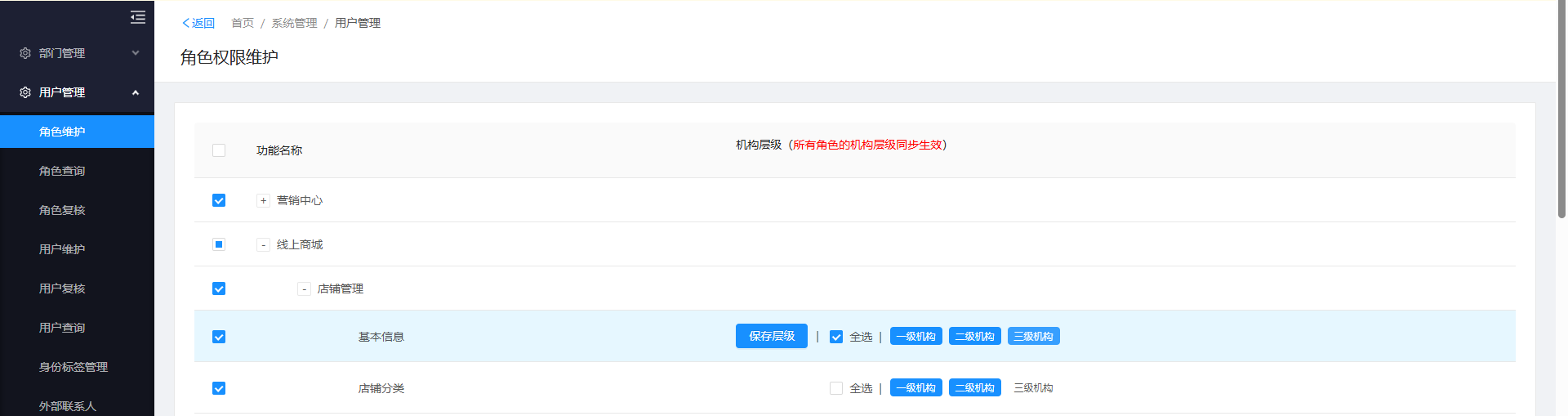 权限默认只对机构层级为一级机构下的用户生效,如果想给其他机构层级的用户赋权,则需要将权限菜单展开,在对应权限的机构层级中进行勾选,如下图所示。