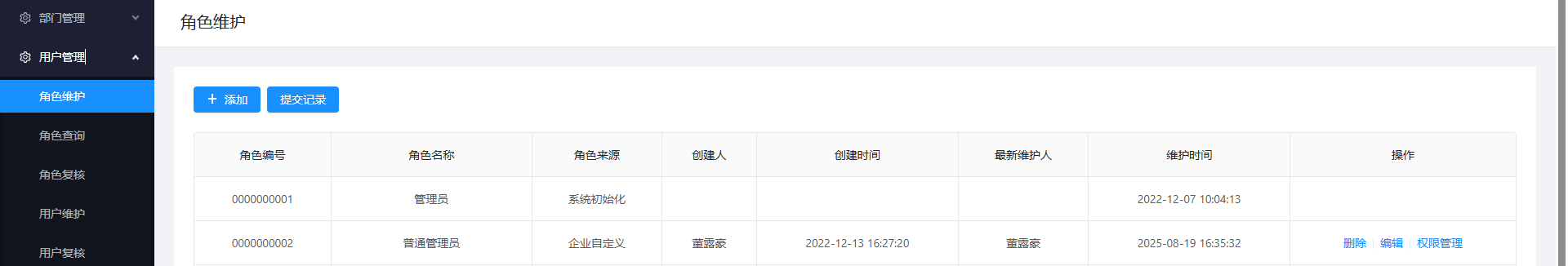 角色是权限的集合体,在【用户管理】-【角色维护】中点击【添加】来新增角色,名称自定义,点击该角色右侧的【权限管理】来赋予对应菜单的权限。
