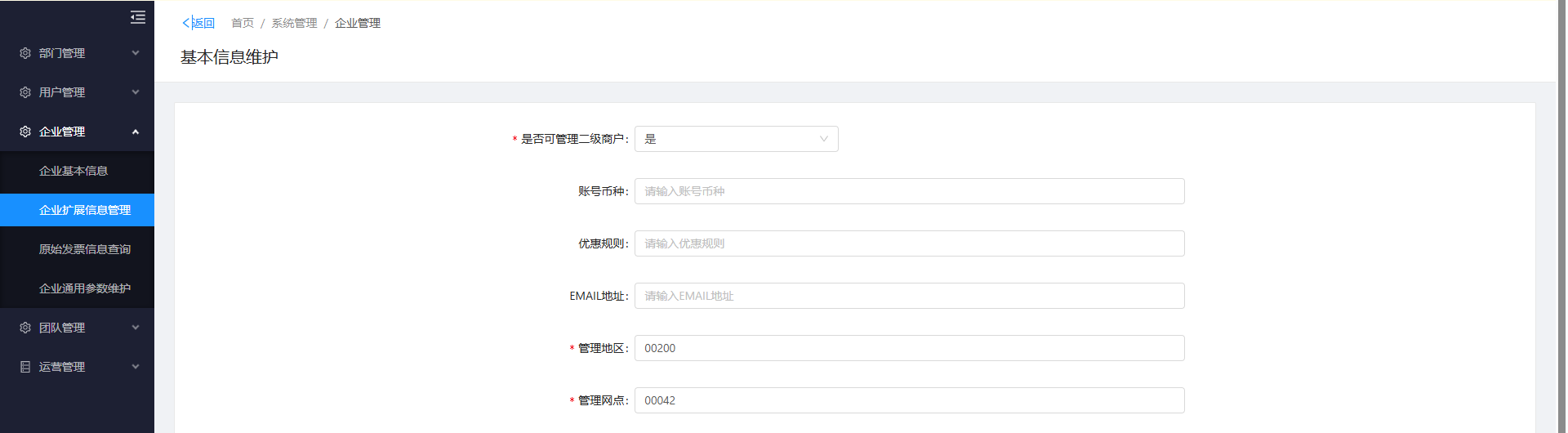 (1)维护企业基本信息,在【企业管理】-【企业扩展信息管理】-【信息维护】-【商户基本信息】,将【是否可管理二级商户】设置为“是”,并维护上【管理地区号】和【管理网点号】,需要写5位,前面补0,例如:管理地区是“00200”,管理网点是“00042”。其中【清算账号】【商户入账账号】【商户退货账号】三项,如果使用新型无卡签约,则需要填写商户档案/服务商档案对应的入账账号,如果不使用新型无卡签约可不填写。