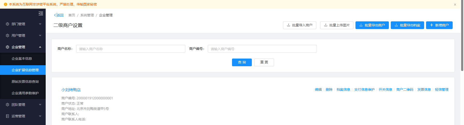 (3)新增二级商户,在【企业管理】-【企业扩展信息管理】的【商户维护】中,点击右上角的【新增商户】,或【批量导入商户】,【机构】和【商户名称】根据实际情况自行勾选和填写。