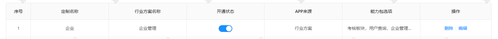点击下一步,这一步配置企业具备的功能,以企业管理为例,首先点击【添加行业方案】,在【APP名称】下拉框选择企业管理,必须选择【能力包】,在能力包下拉框中按需选择,添加完毕后点击提交。