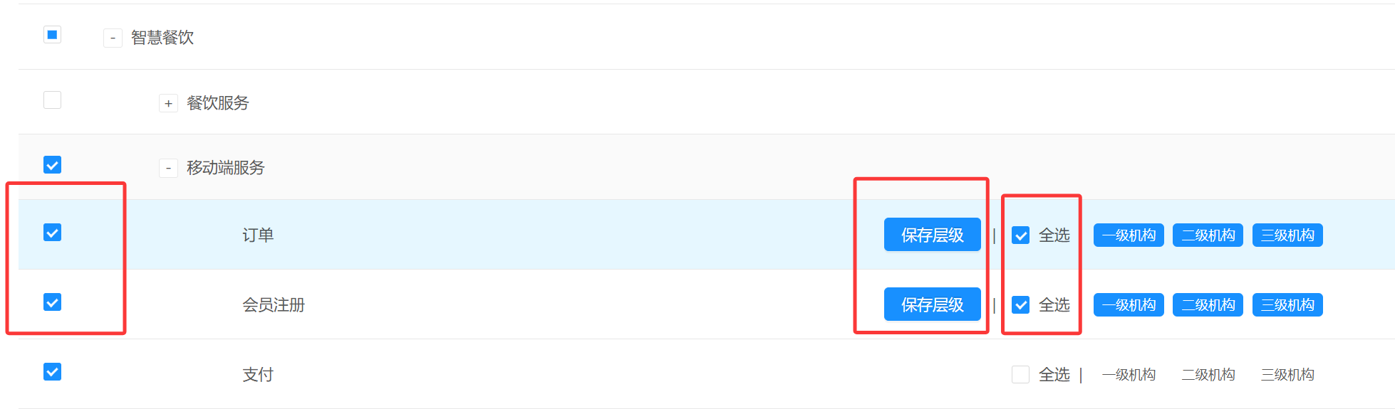 进入企业管理-用户管理-角色维护,添加一个角色,名称任意,然后点击“权限管理”,勾选智慧餐饮-移动端服务相应权限,并勾选右侧相应层级,如果不了解,可将权限全部勾选,右边层级也全部勾选,并逐个点击“保存层级”。